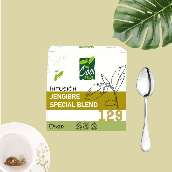 Infusión de Jengibre, Hojas de menta troceadas, lemongras, cáscara de limón y regaliz. Contiene 20 pirámides de lujo.